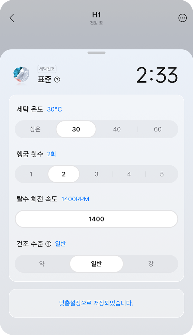 수온, 헹굼 횟수, 건조 정도 등의 설정을 조정해 세탁 및 건조 모드를 맞춤화하여 완벽한 세탁 관리를 실현하세요.